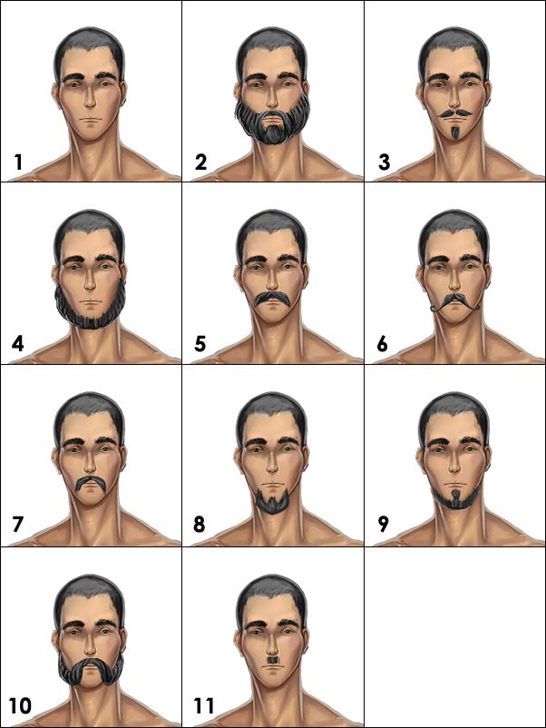 Male Beard/Moustache 1 - clean shaven 2 - cave man look 3 - The Three Muskateers 4 - Amish fashion 5 - Freddie Mercury Tash (tash is short for moustache) 6 - The Poirot 7 - The Village People wannabe 8 - Chin Warmer 9 - Au Natural 10 - Wooly cheeks 11 - Best not go there!!!!