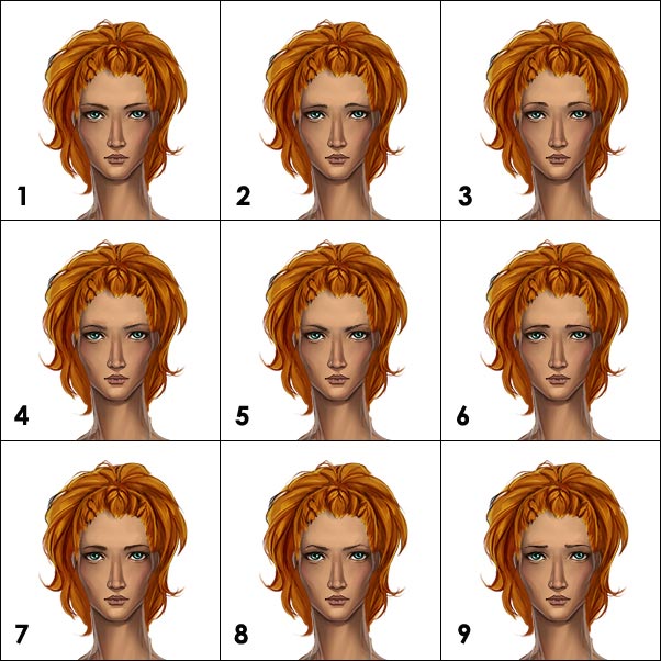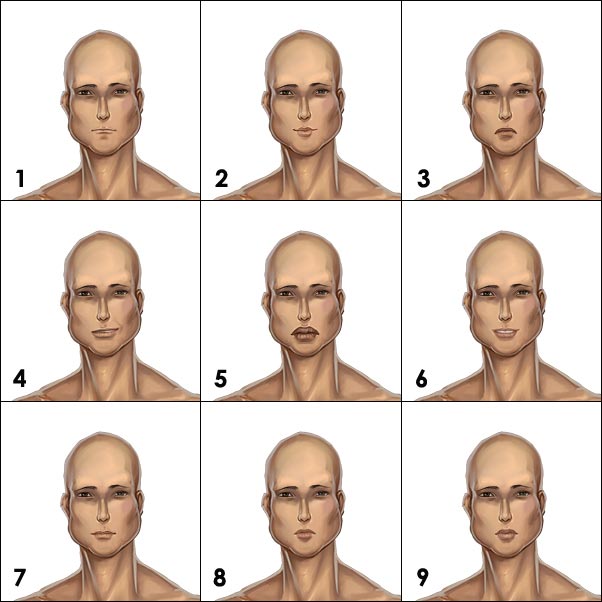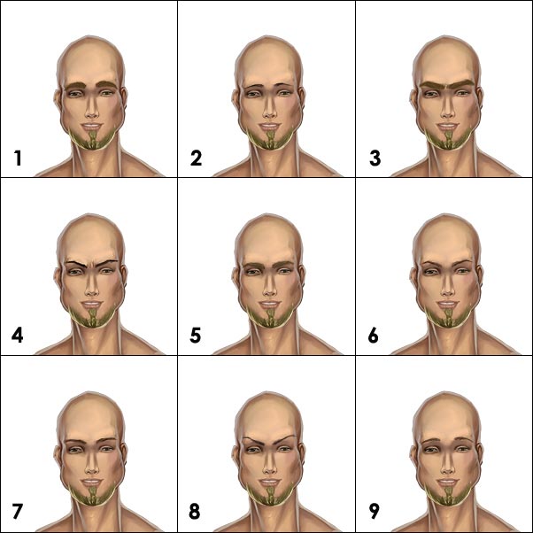 Male Eyes: 1-Beady 2-Big 3-Squinty 4-Happy 5-Shifty 6-Small 7-Sad 8-Shadowed 9-Slanted