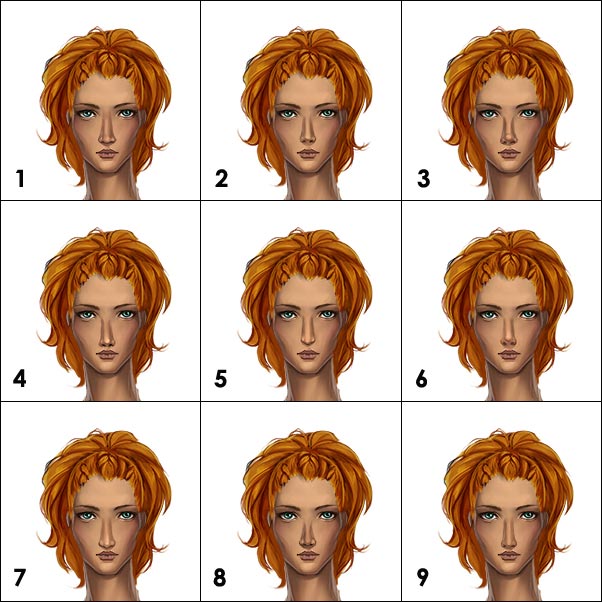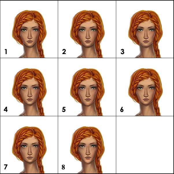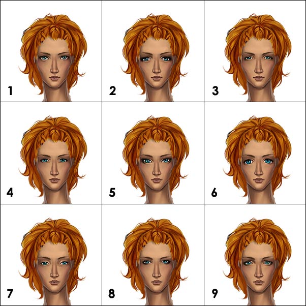 In the hero generator you will be able to customize hero or heroine's face by picking elements from available ones kinda like identikit. I think just numbering possible eyebrows or noses is not fun, so I thought maybe if I post pictures of all possible options you will make a name for them and the hero generator screen will be a bit less boring without face elements like "Chin #3" and "Lips #7". Female Eyes