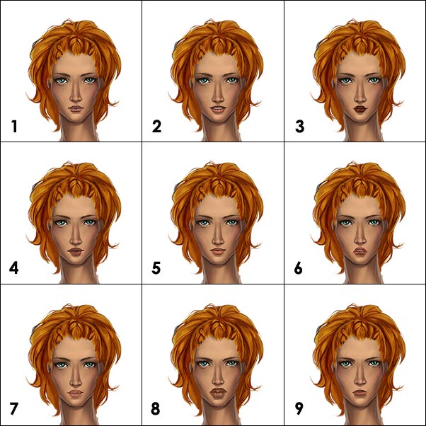 Female Lips: 1-Chapped 2-Grin 3-Painted 4-Pucker 5-Smirk 6-Grimace 7-Full 8-Thick 9-Pout